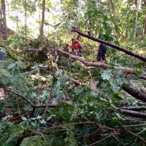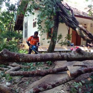 Memangkas pohon yang berisiko tumbang – Warga yang memiliki pohon besar di sekitar rumah sebaiknya melakukan pemangkasan secara berkala untuk mengurangi risiko pohon tumbang akibat angin kencang.